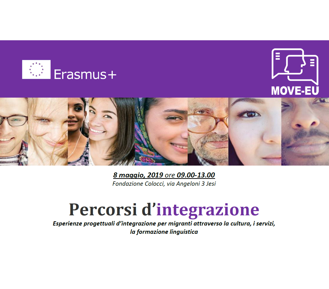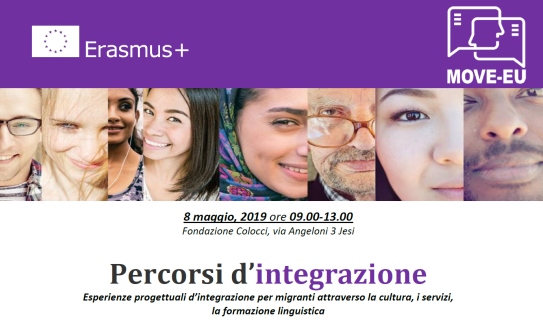 Siamo lieti di invitarvi mercoledì 8 maggio 2019 alle ore 9.00 all’evento formativo e informativo dal titolo “PERCORSI D’INTEGRAZIONE: Esperienze progettuali d’integrazione per migranti attraverso la cultura, i servizi, la formazione linguistica”, organizzato da COOSS e finanziato dal progetto europeo MOVE-EU che si terrà presso l’aula T2 della Fondazione Colocci, (via Angeloni 3, Jesi).